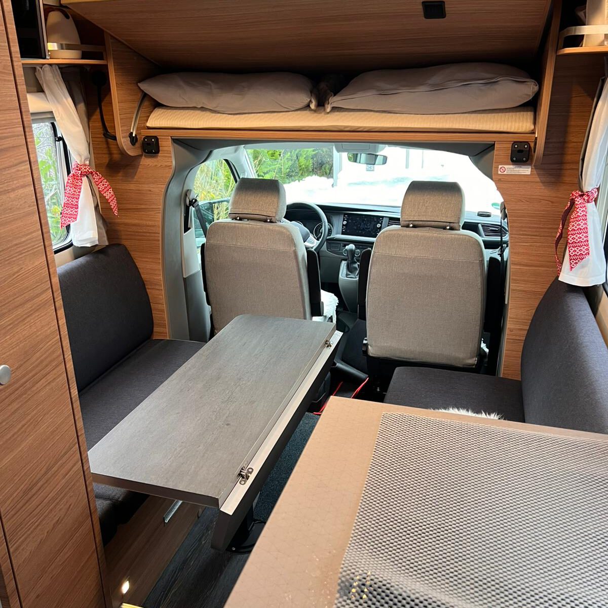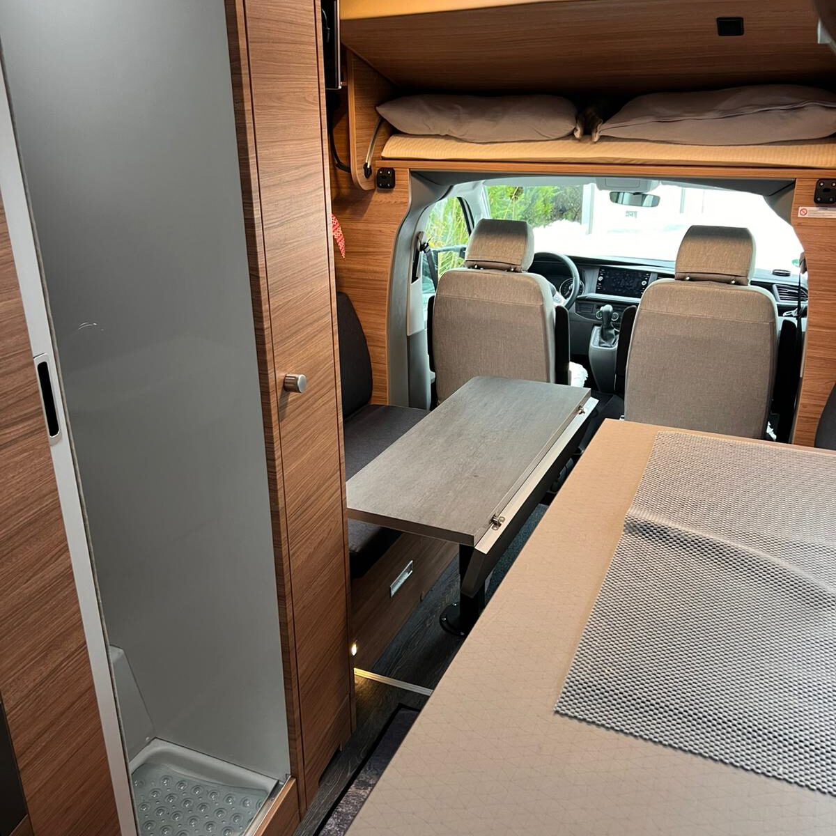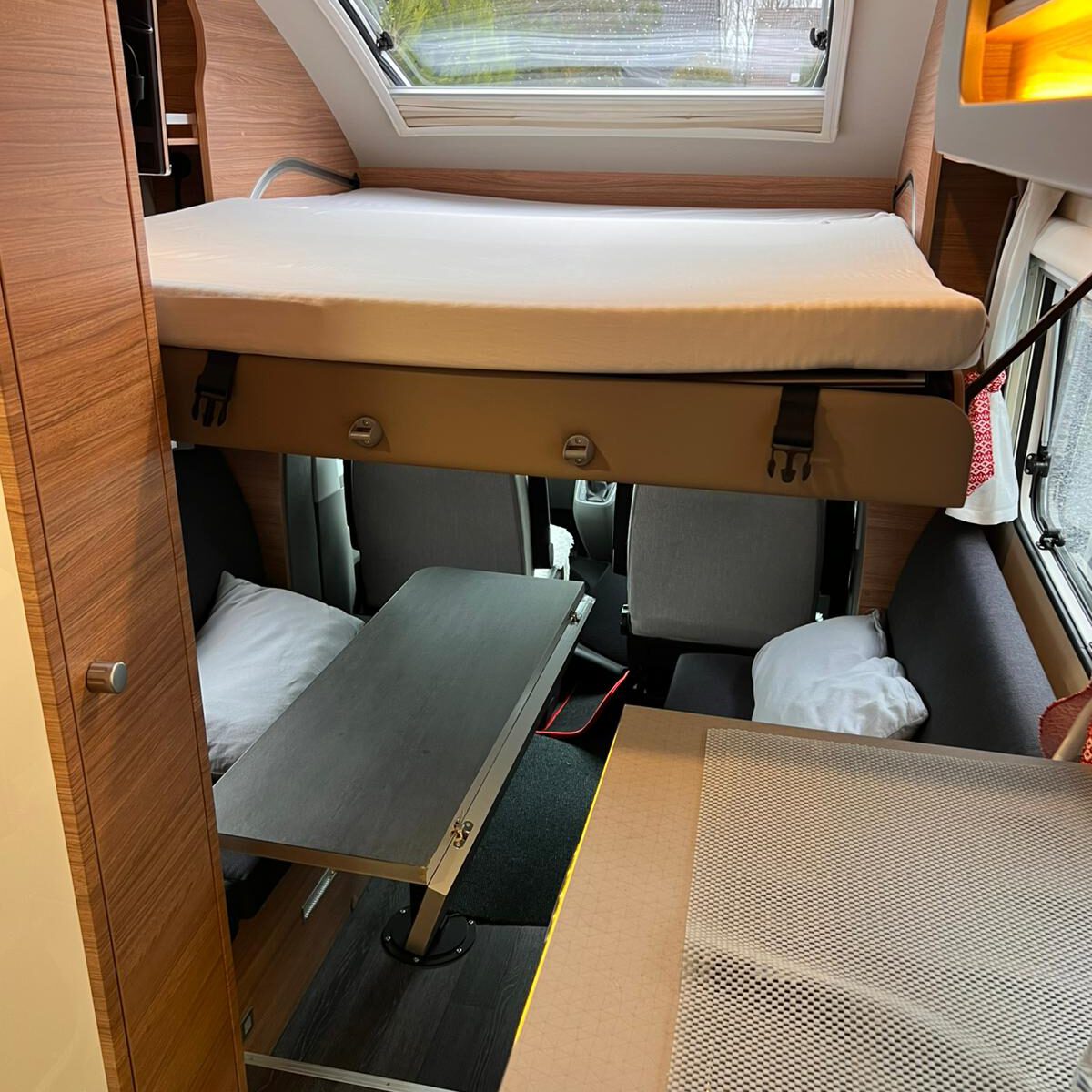 Geschlafen wird im Slide-Out Bett über dem Fahrerhaus und oder unten in der Sitzgruppe.