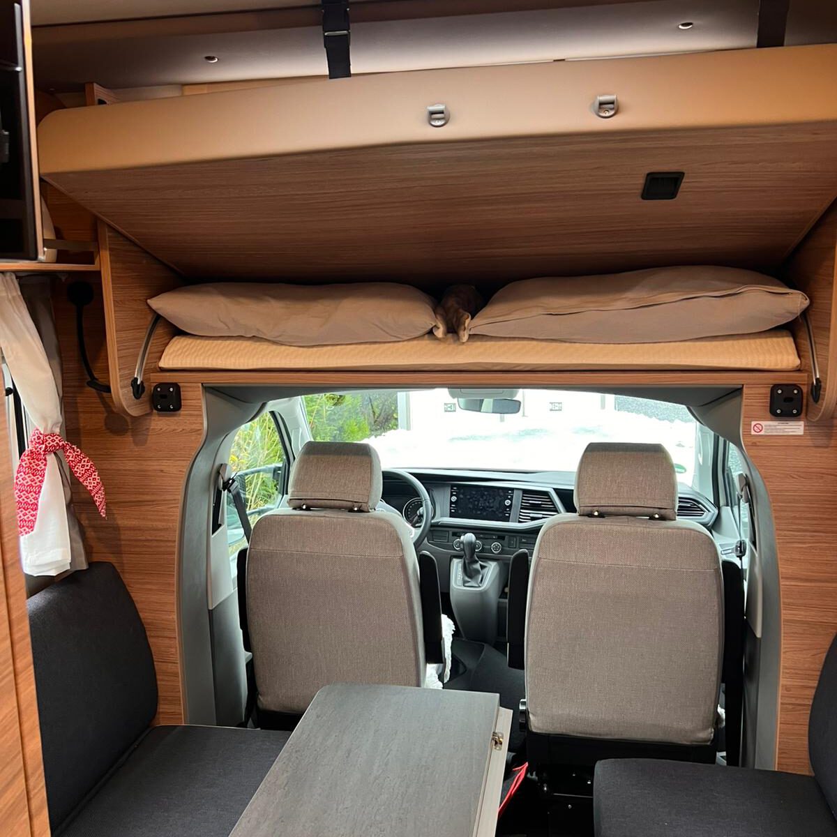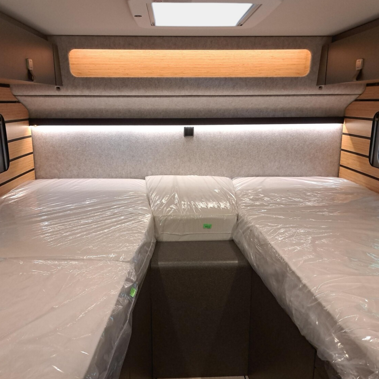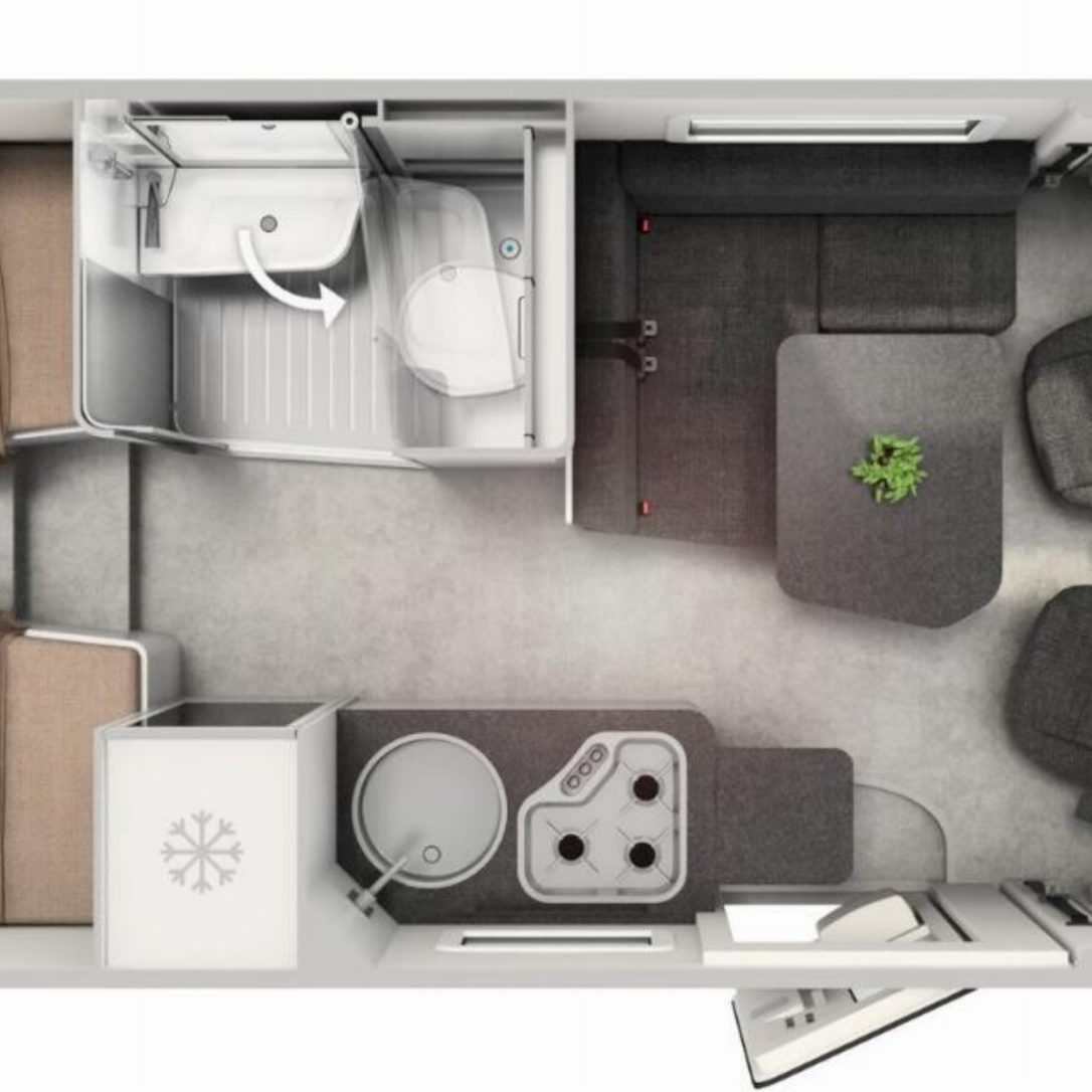 Geschlafen wird im Slide-Out Bett über dem Fahrerhaus und oder unten in der Sitzgruppe.