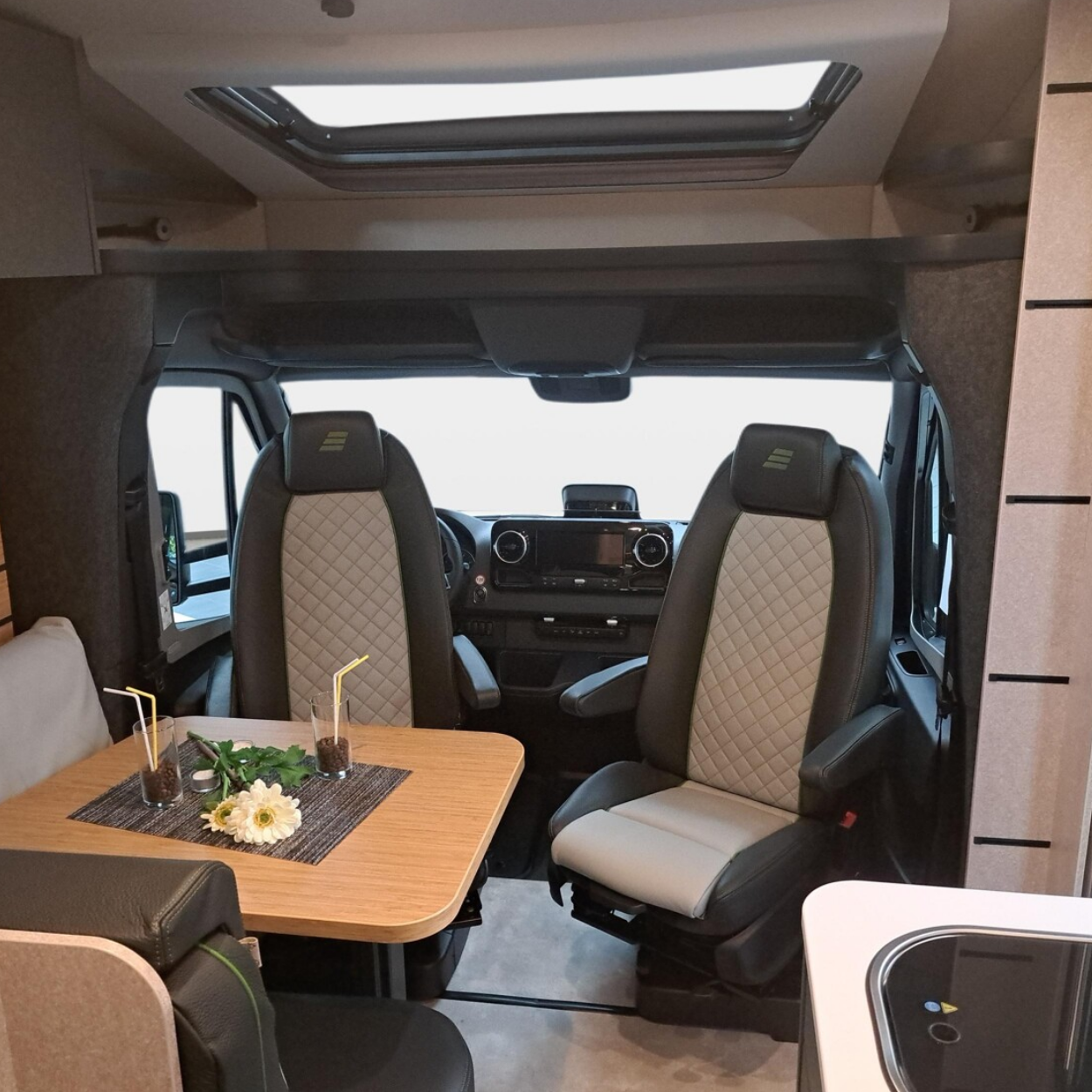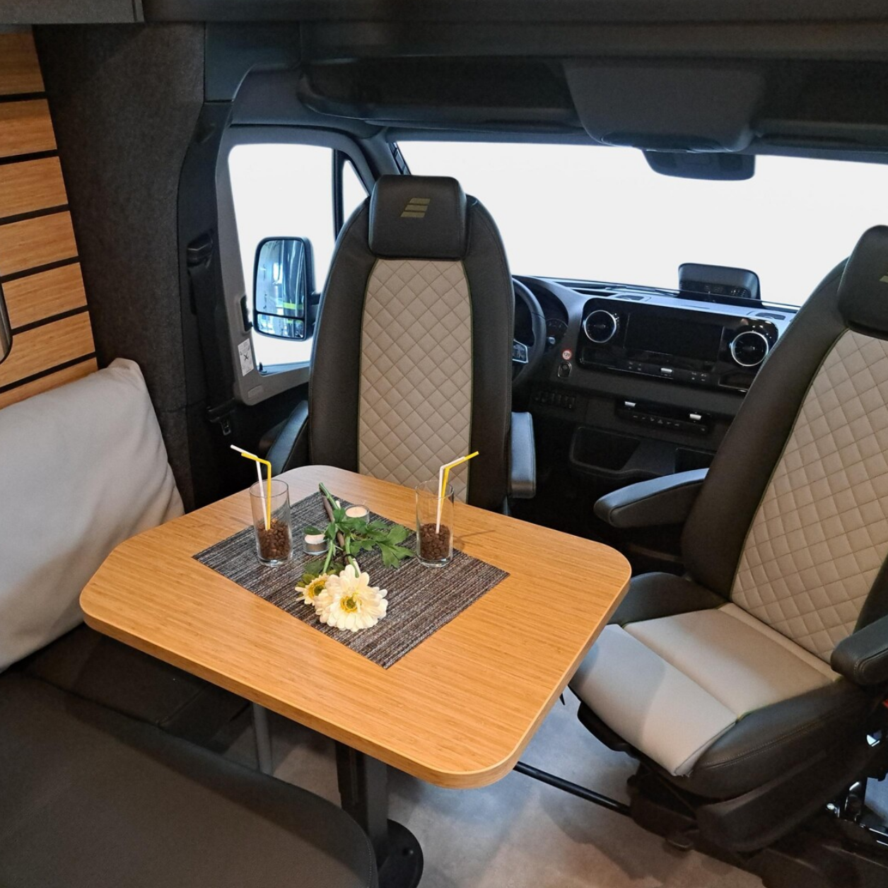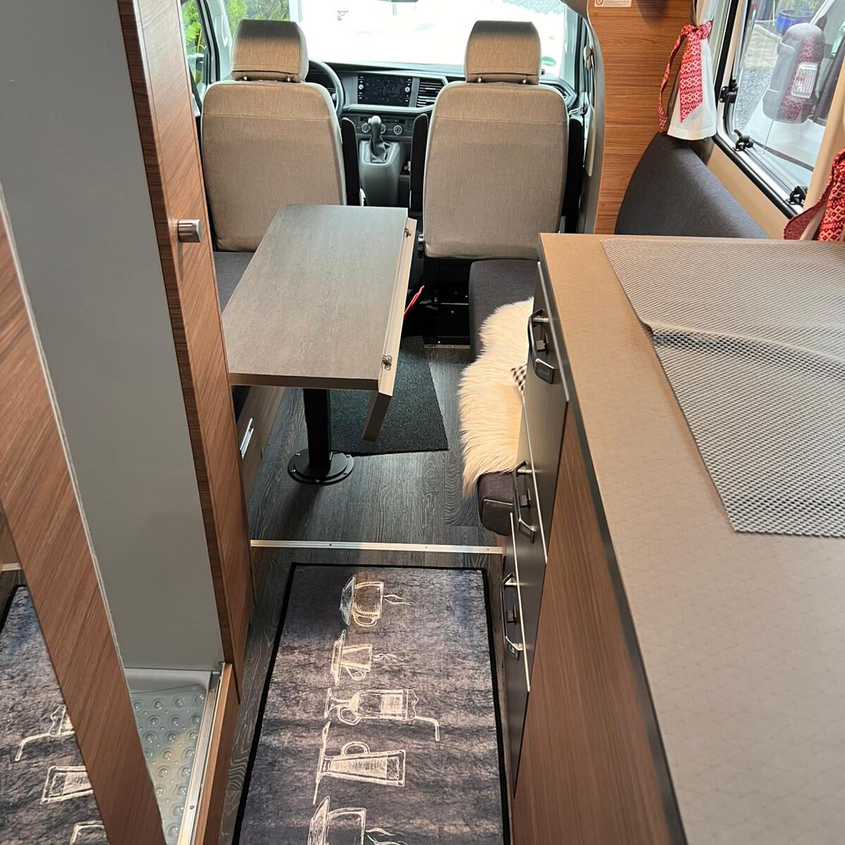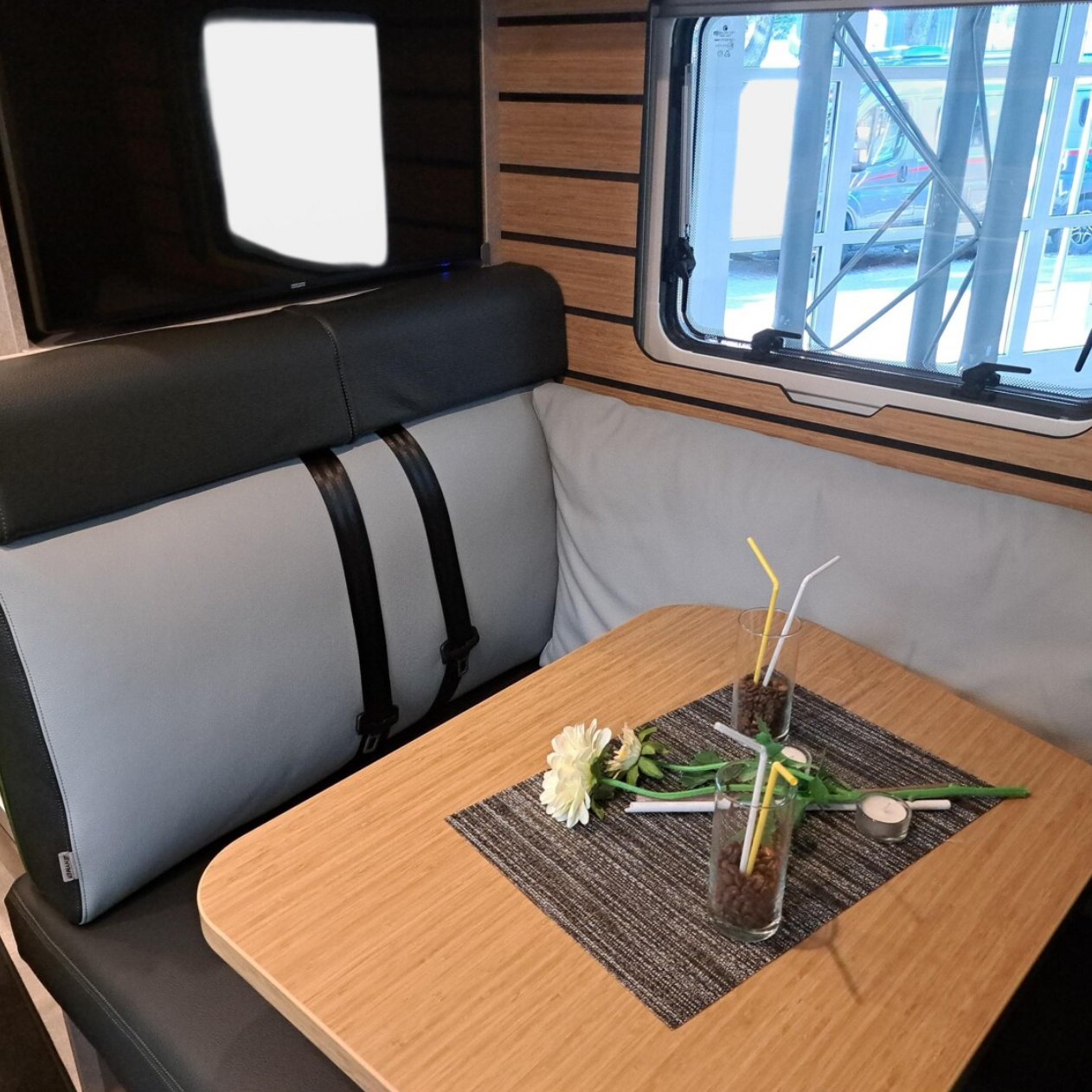 Der DC-Bulli hat kein festes Bett, denn mit seiner Side-by-Side Sitzgruppe ist das Thema Wohnen im Fokus.