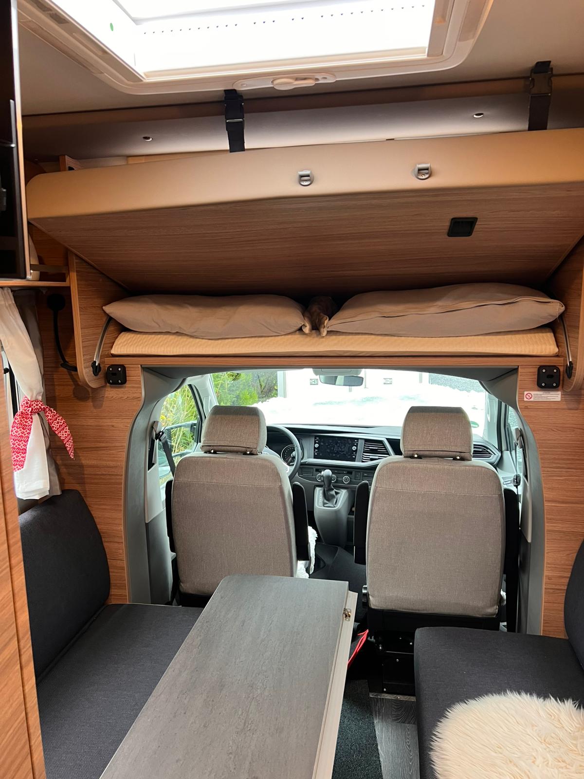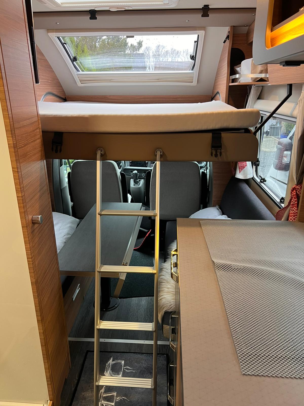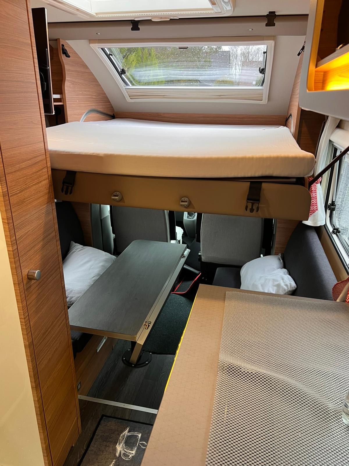 Geschlafen wird im Slide-Out Bett über dem Fahrerhaus und oder unten in der Sitzgruppe.