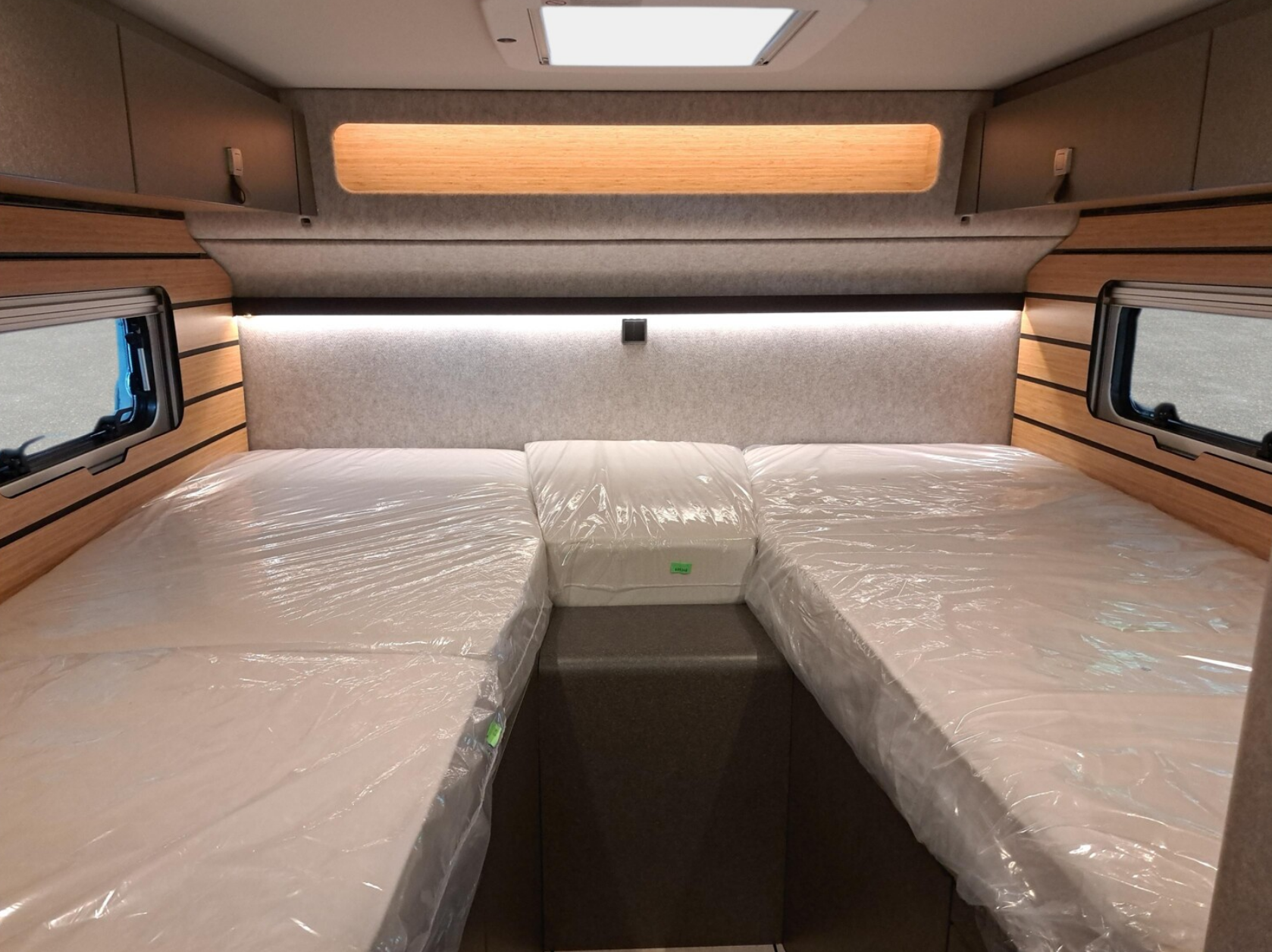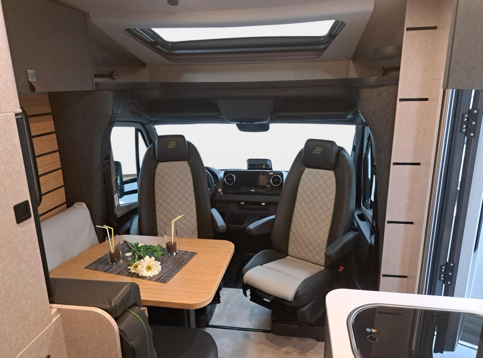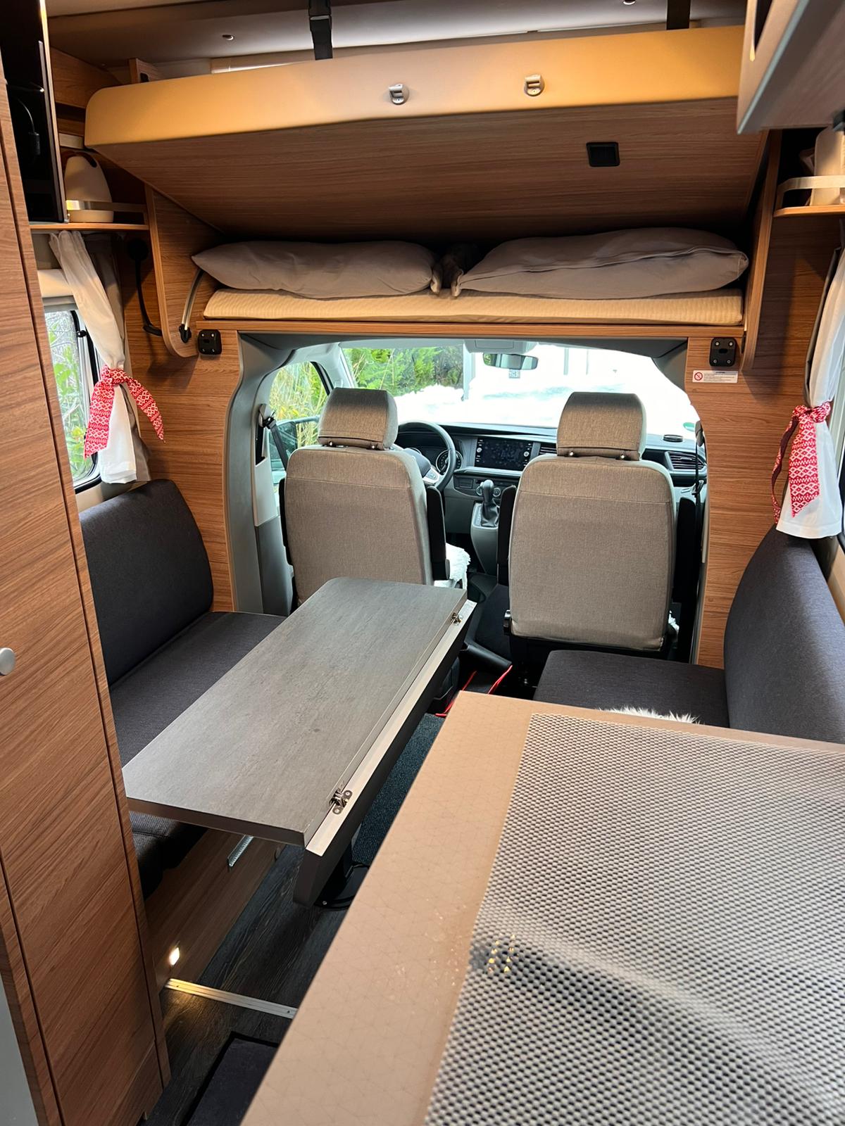 Geschlafen wird im Slide-Out Bett über dem Fahrerhaus und oder unten in der Sitzgruppe.