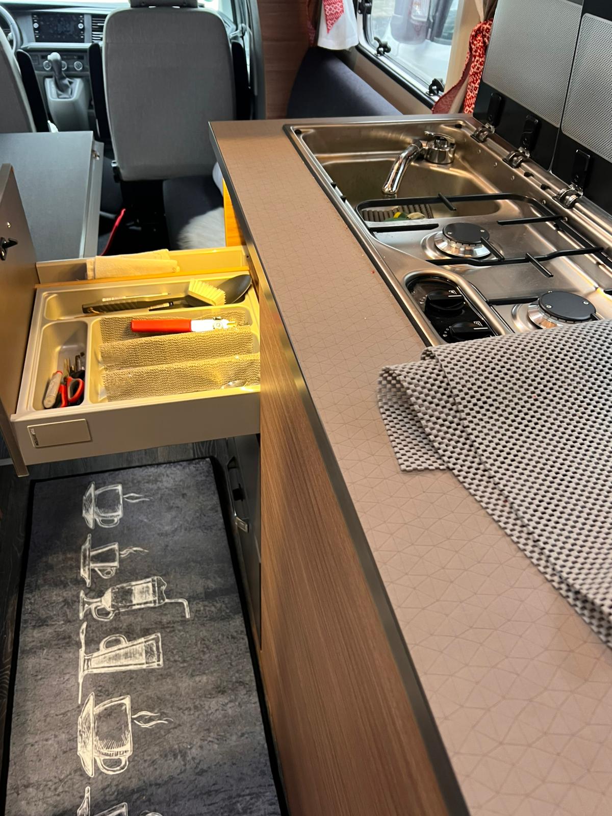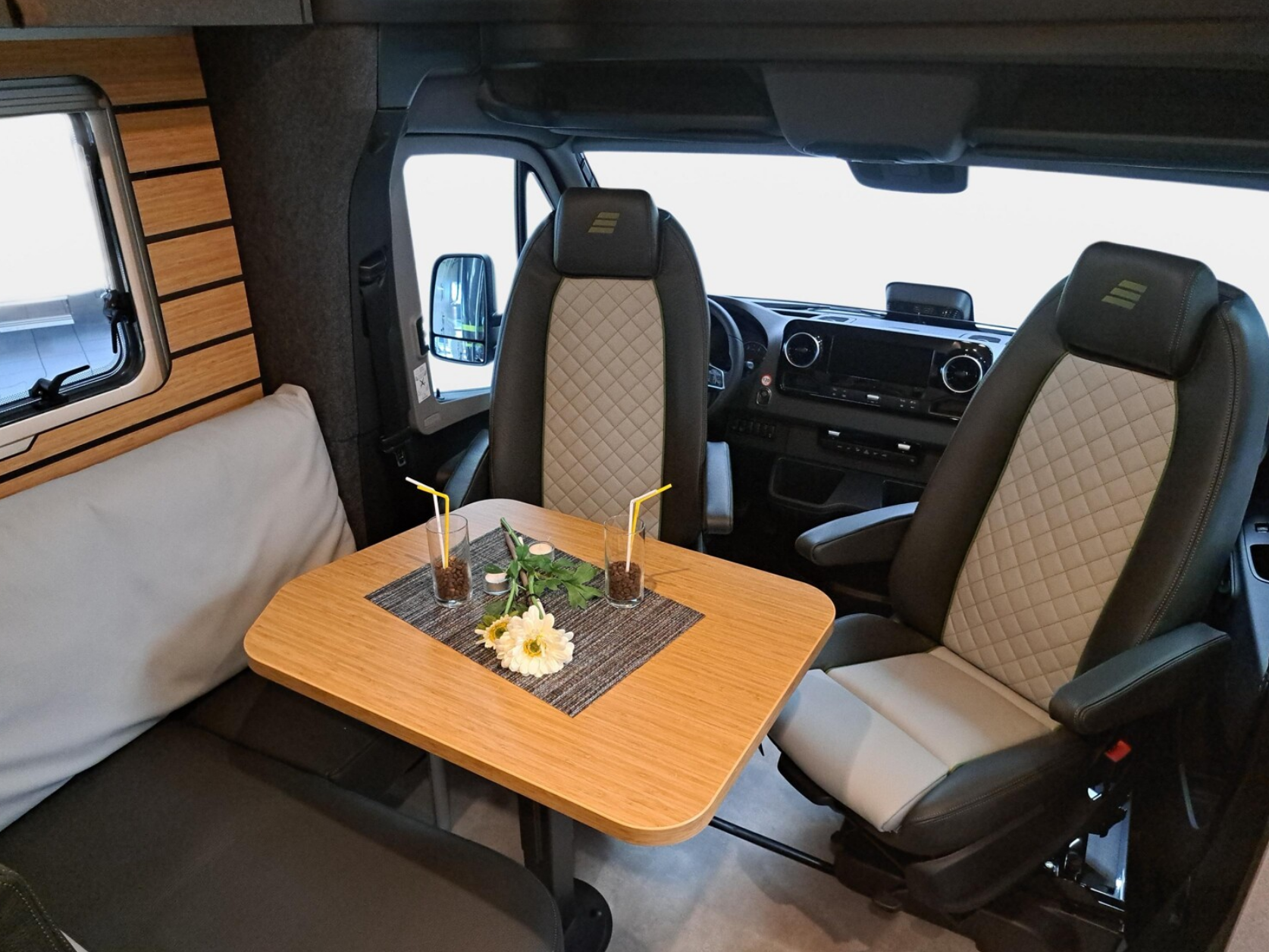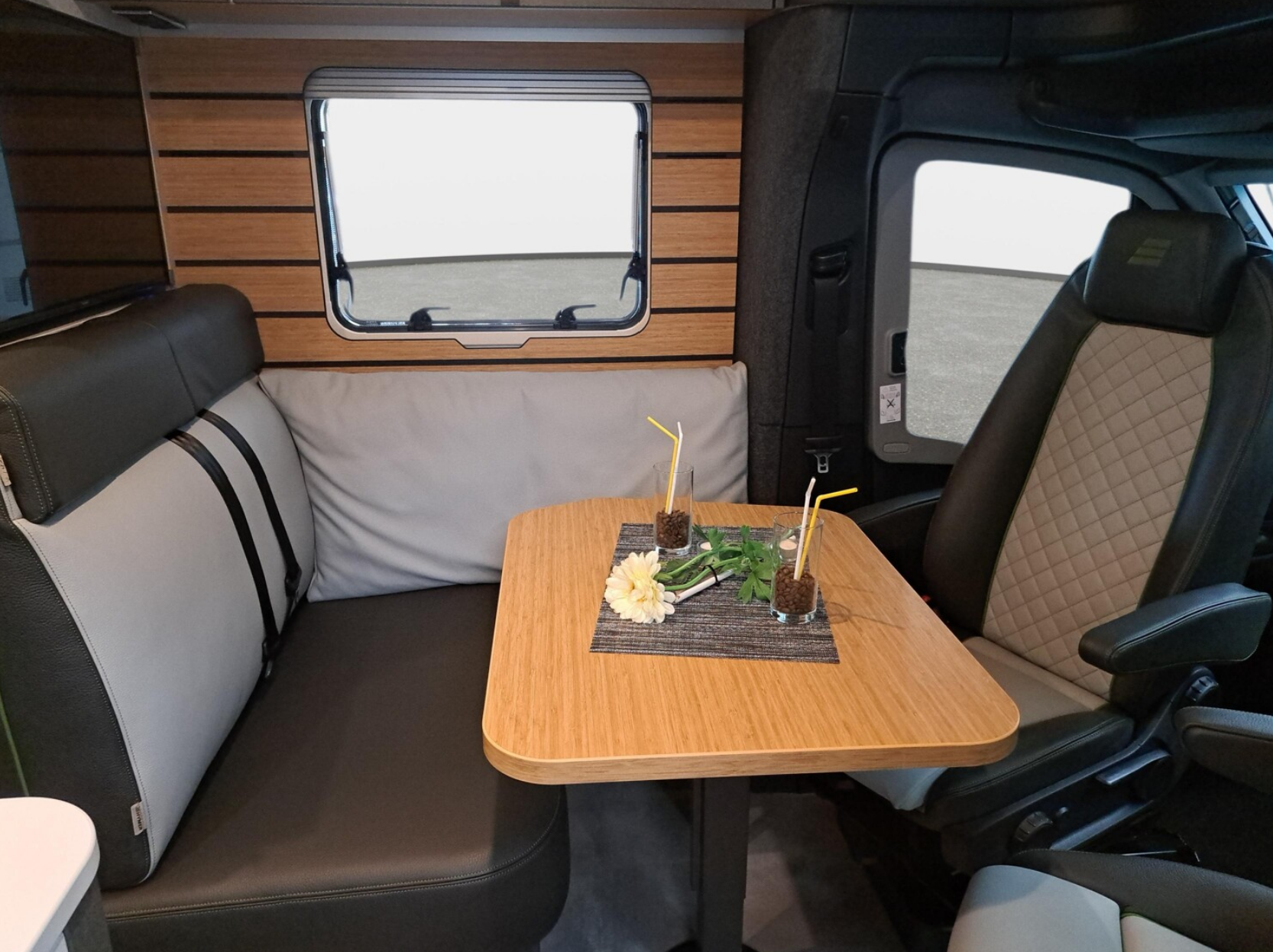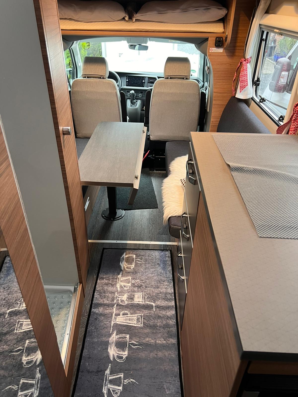 Der DC-Bulli hat kein festes Bett, denn mit seiner Side-by-Side Sitzgruppe ist das Thema Wohnen im Fokus.